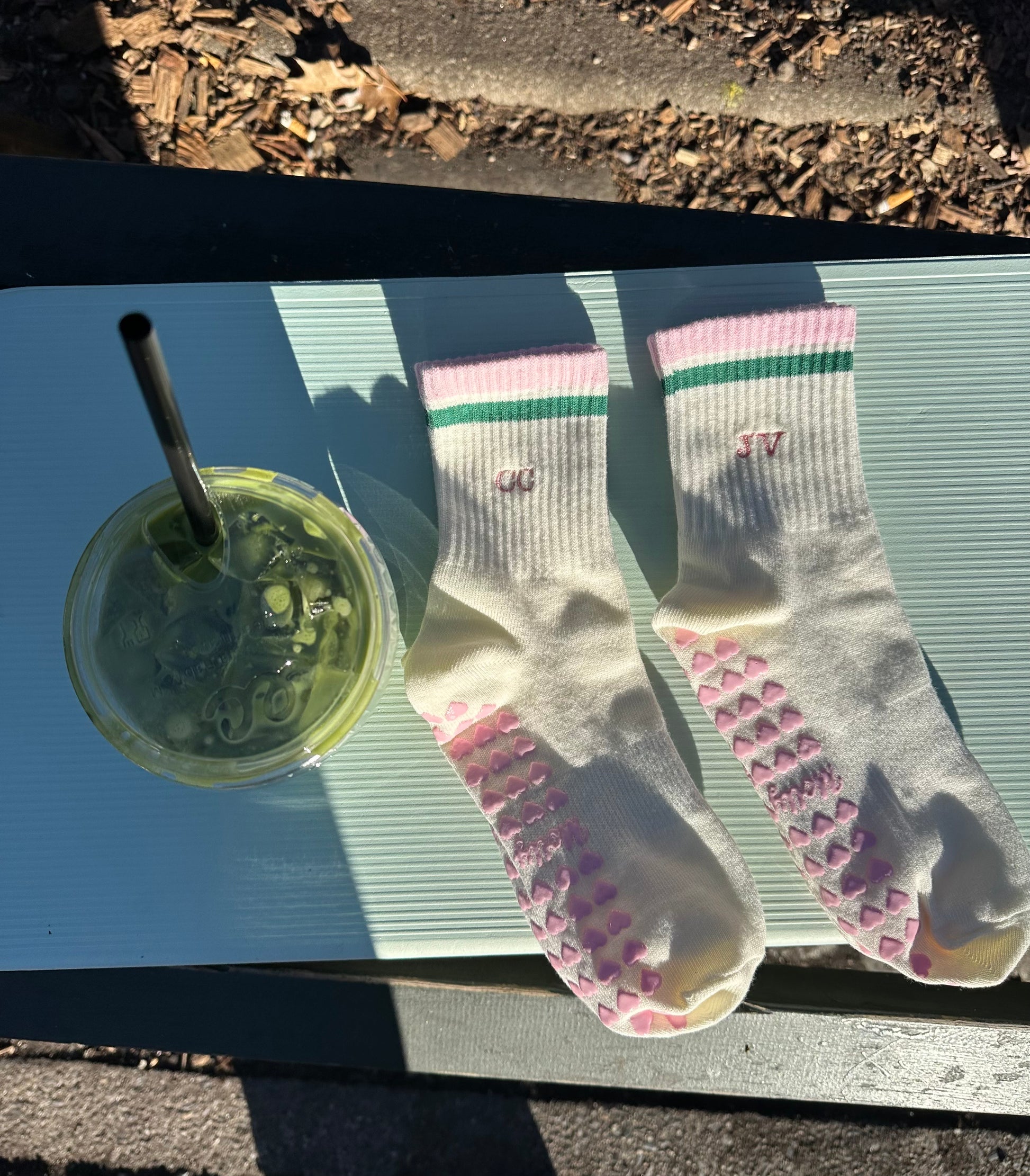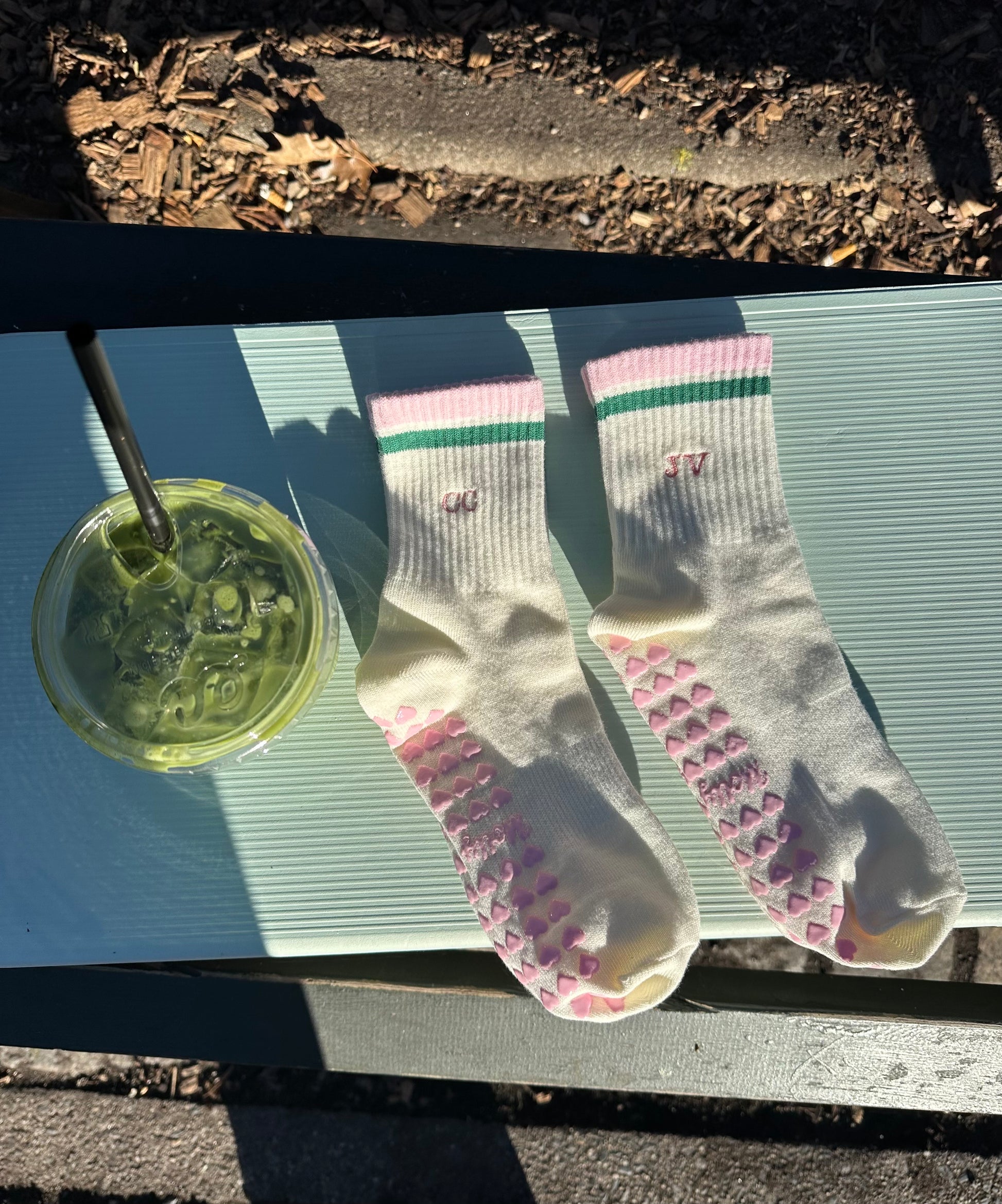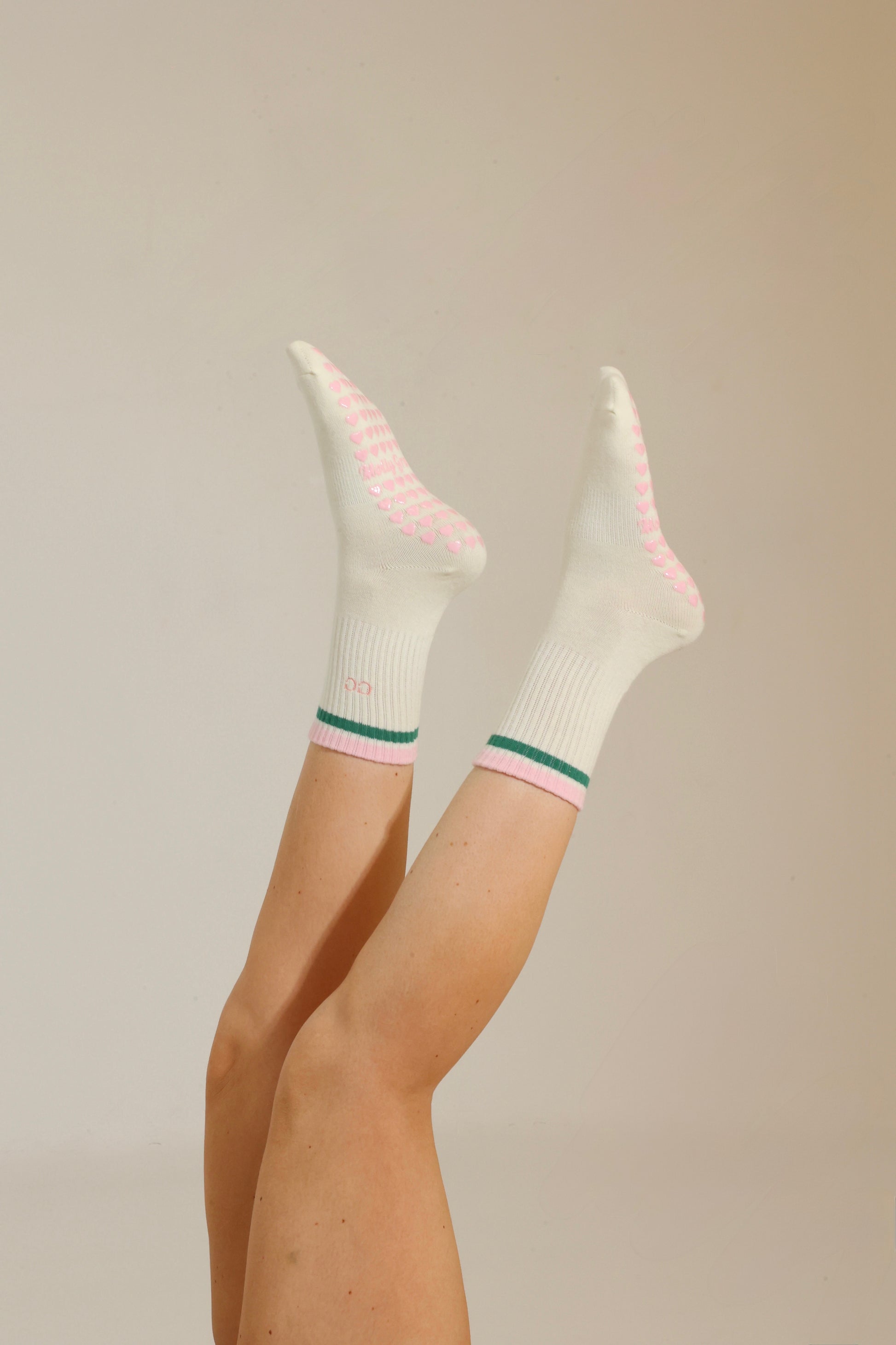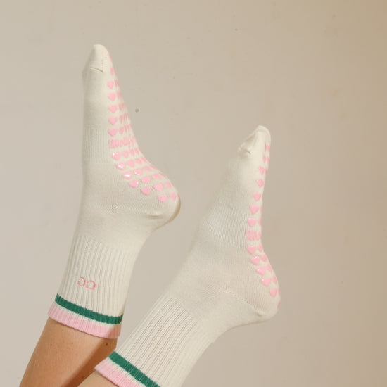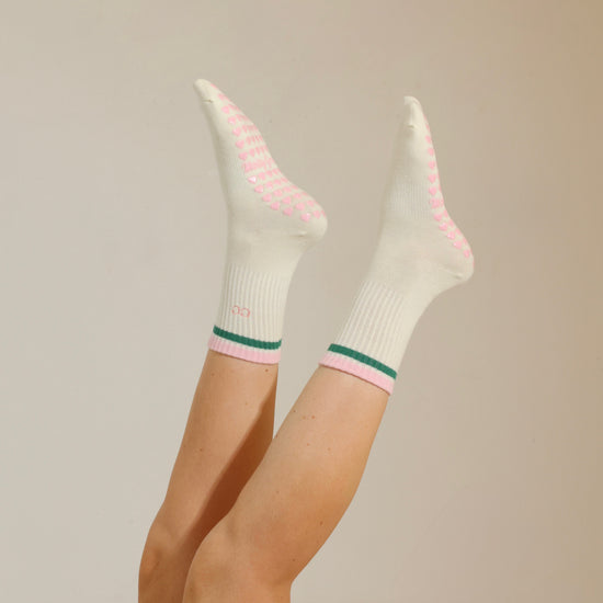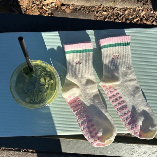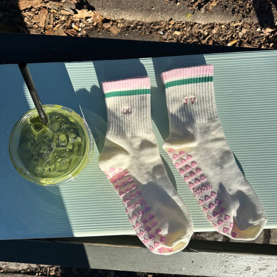 Pink & green striped tube socks with custom initials and pink heart non-slip grips. Designed for Pilates, barre, yoga, and studio workouts, these socks offer a secure fit with a sporty-cute look and a personalized touch you’ll love on and off the mat.