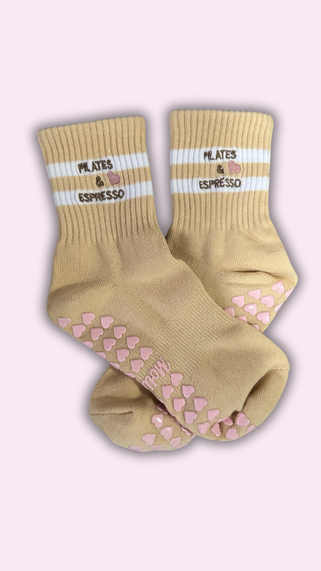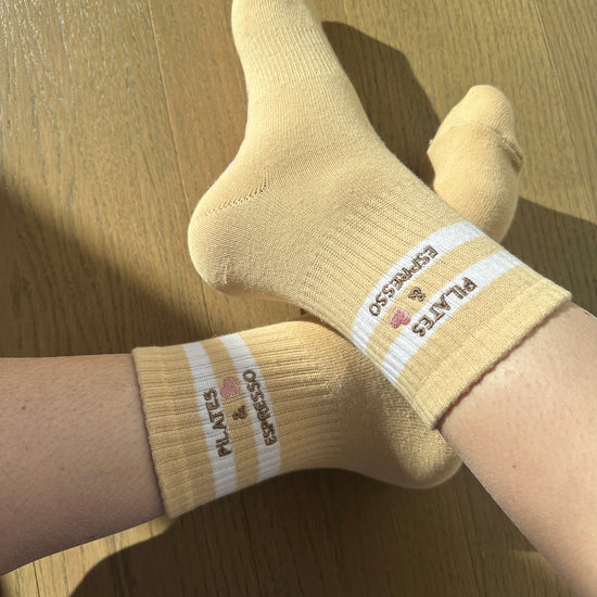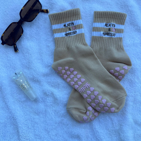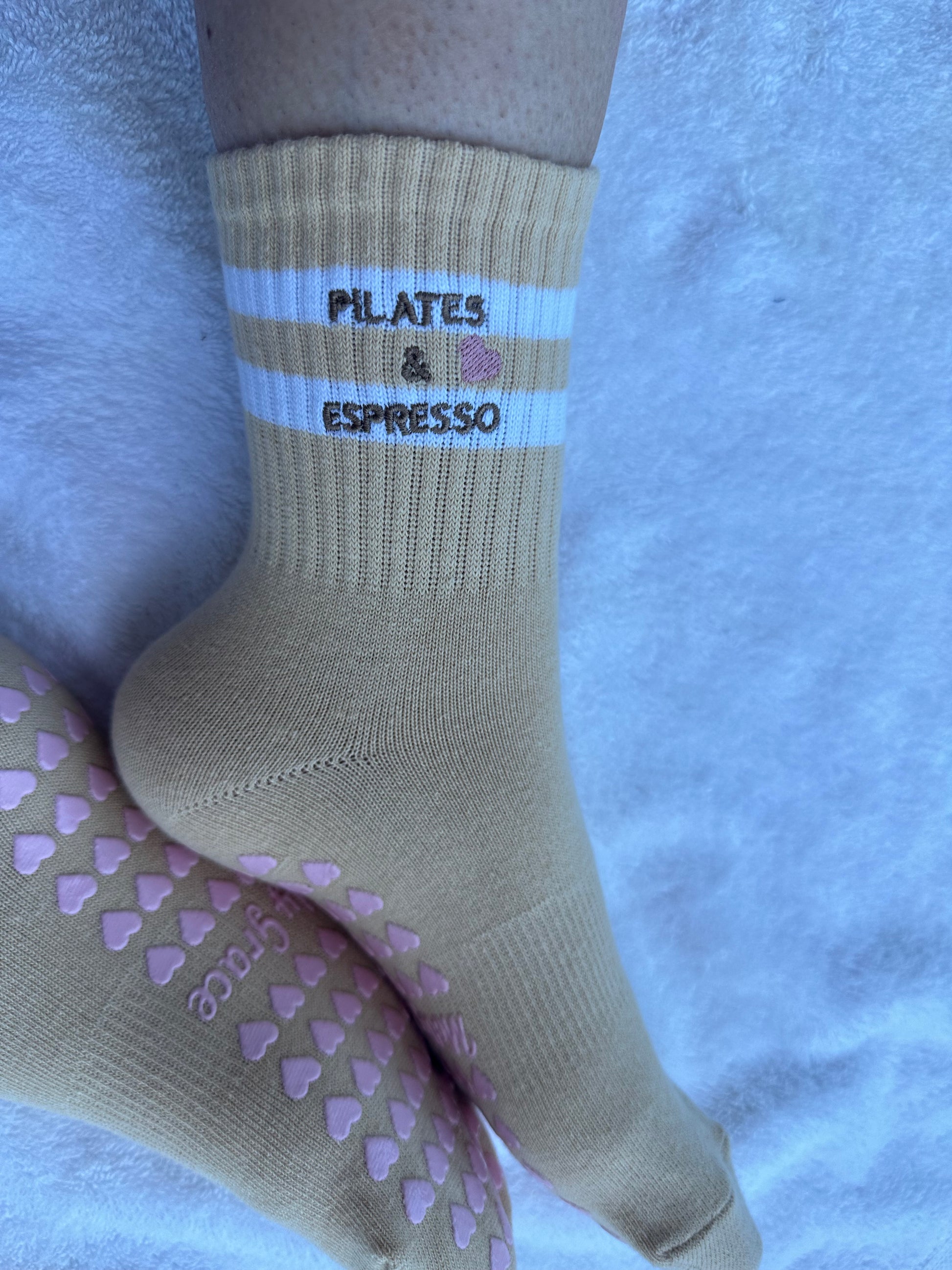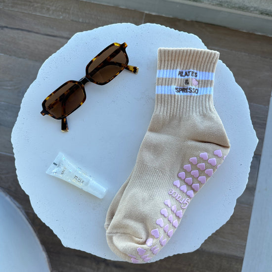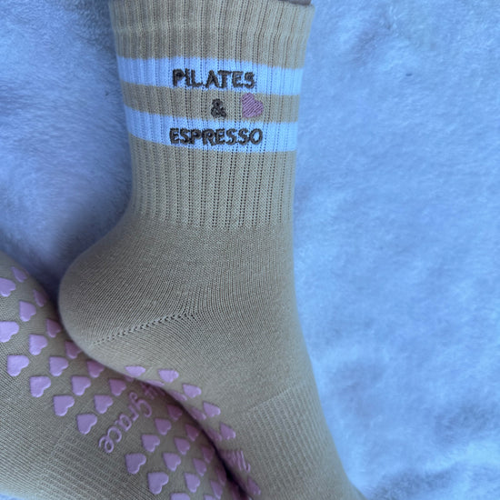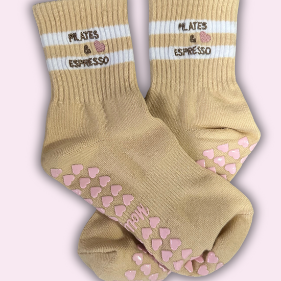 Introducing our Pilates Grip Socks with Heart Grips, featuring the charming phrase "PILATES & ESPRESSO" Step into your fitness journey with love and style. Crafted for comfort and stability, these socks are perfect for Pilates & espresso enthusiasts. Let every step be a declaration of your dedication to wellness.