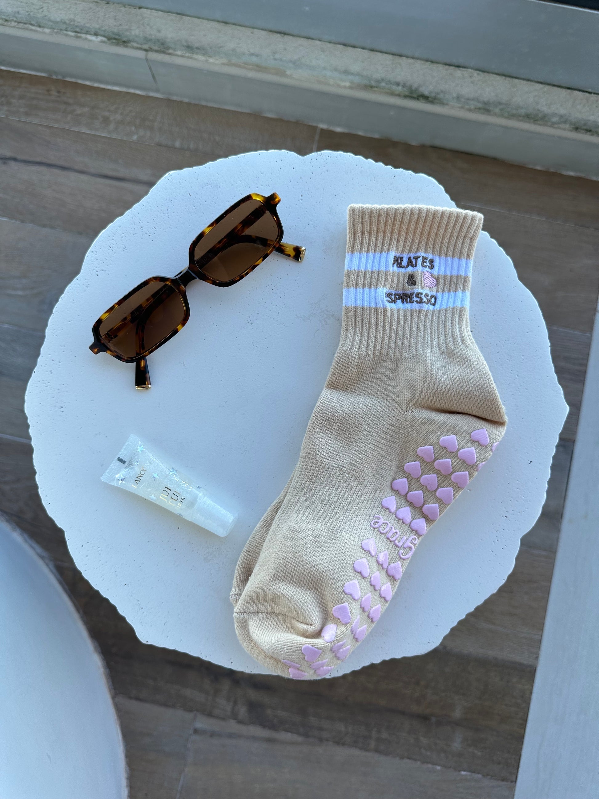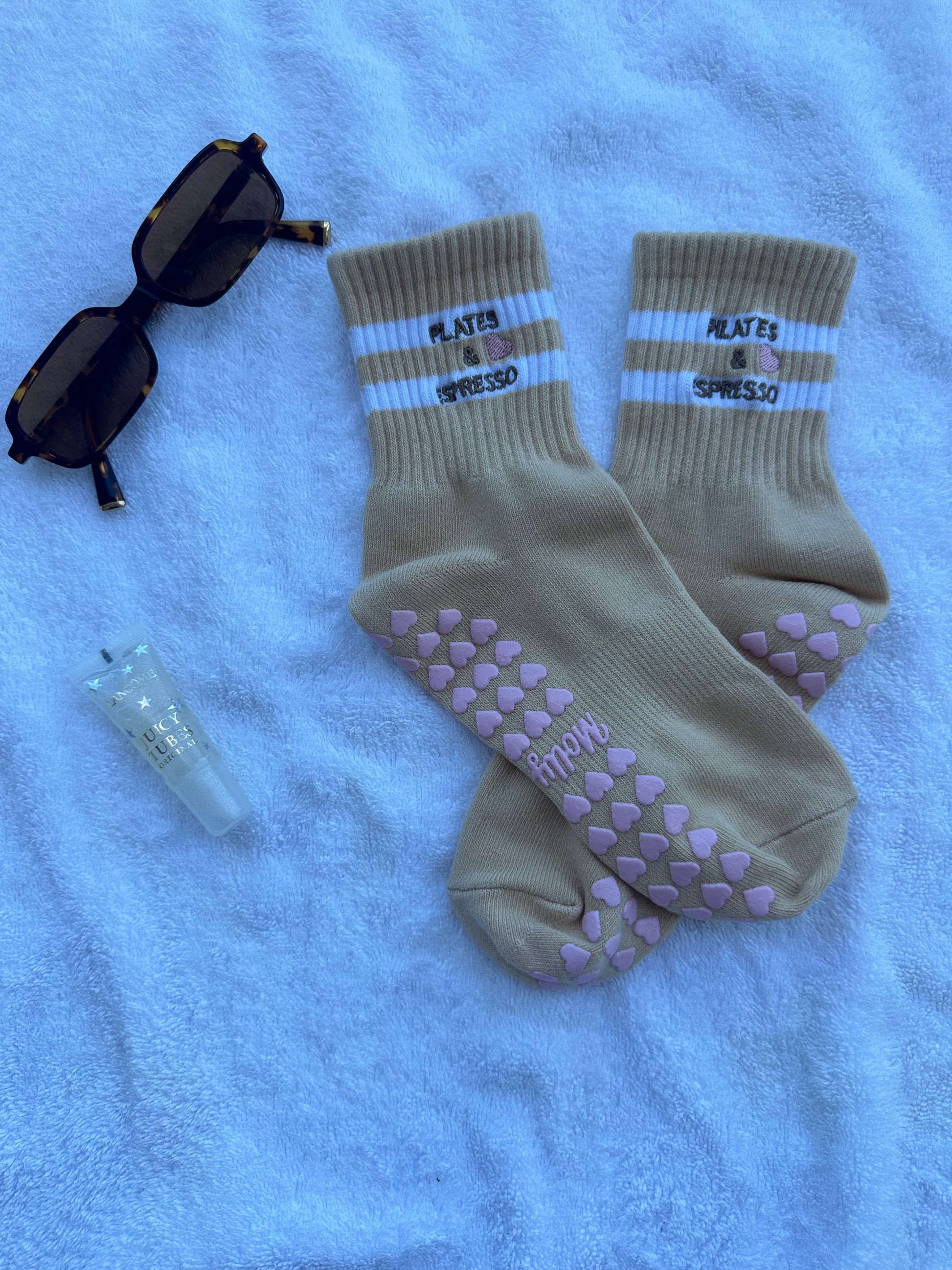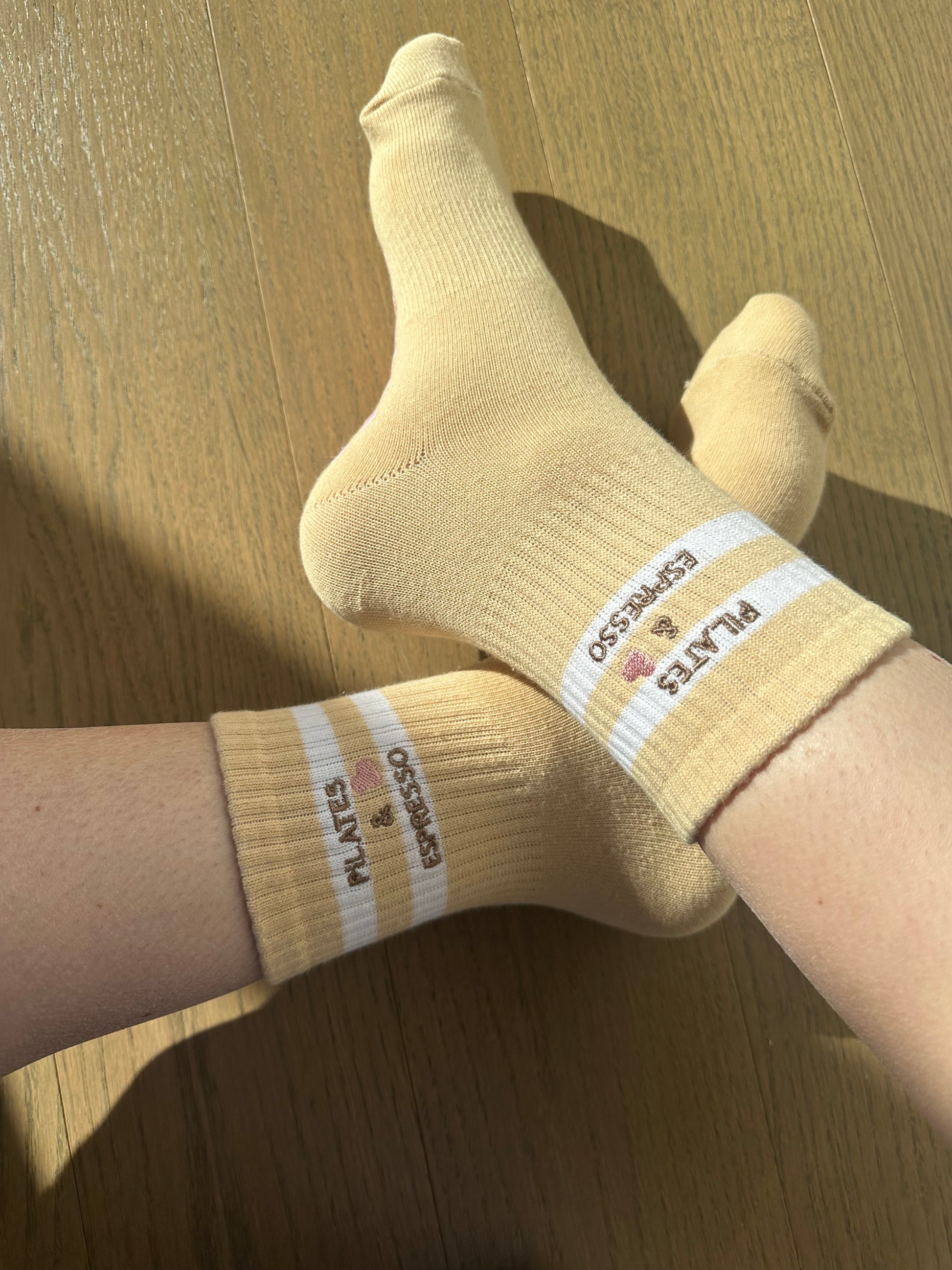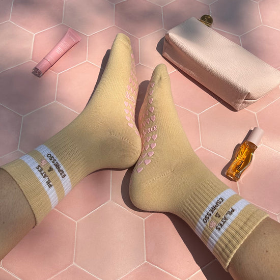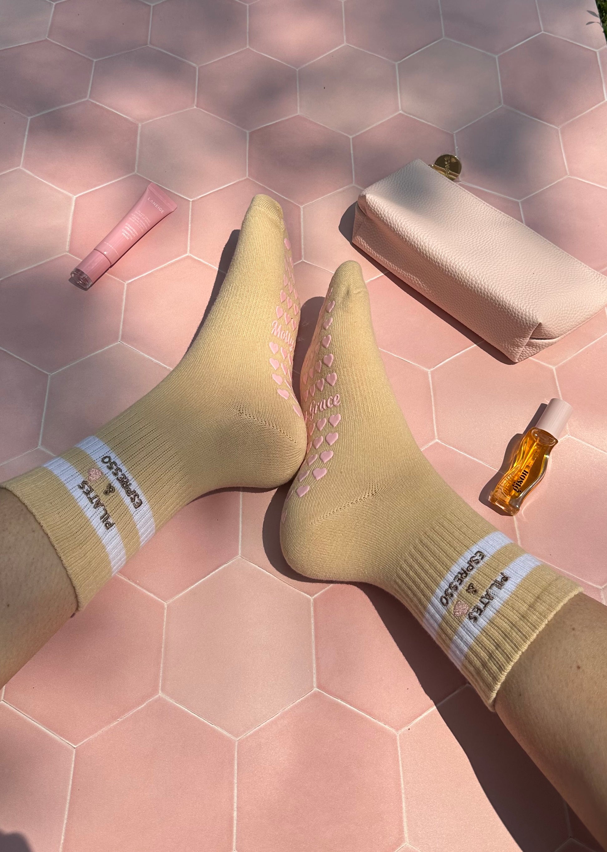 Introducing our Pilates Grip Socks with Heart Grips, featuring the charming phrase "PILATES & ESPRESSO" Step into your fitness journey with love and style. Crafted for comfort and stability, these socks are perfect for Pilates & espresso enthusiasts. Let every step be a declaration of your dedication to wellness.