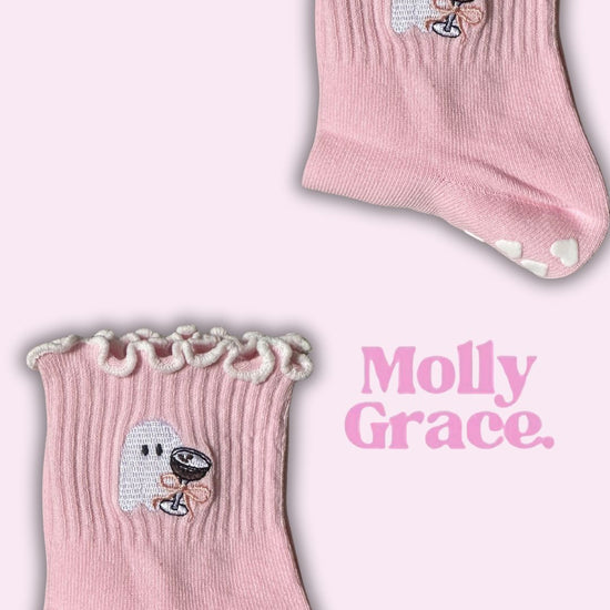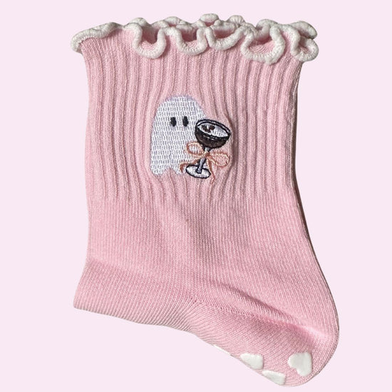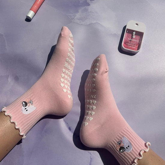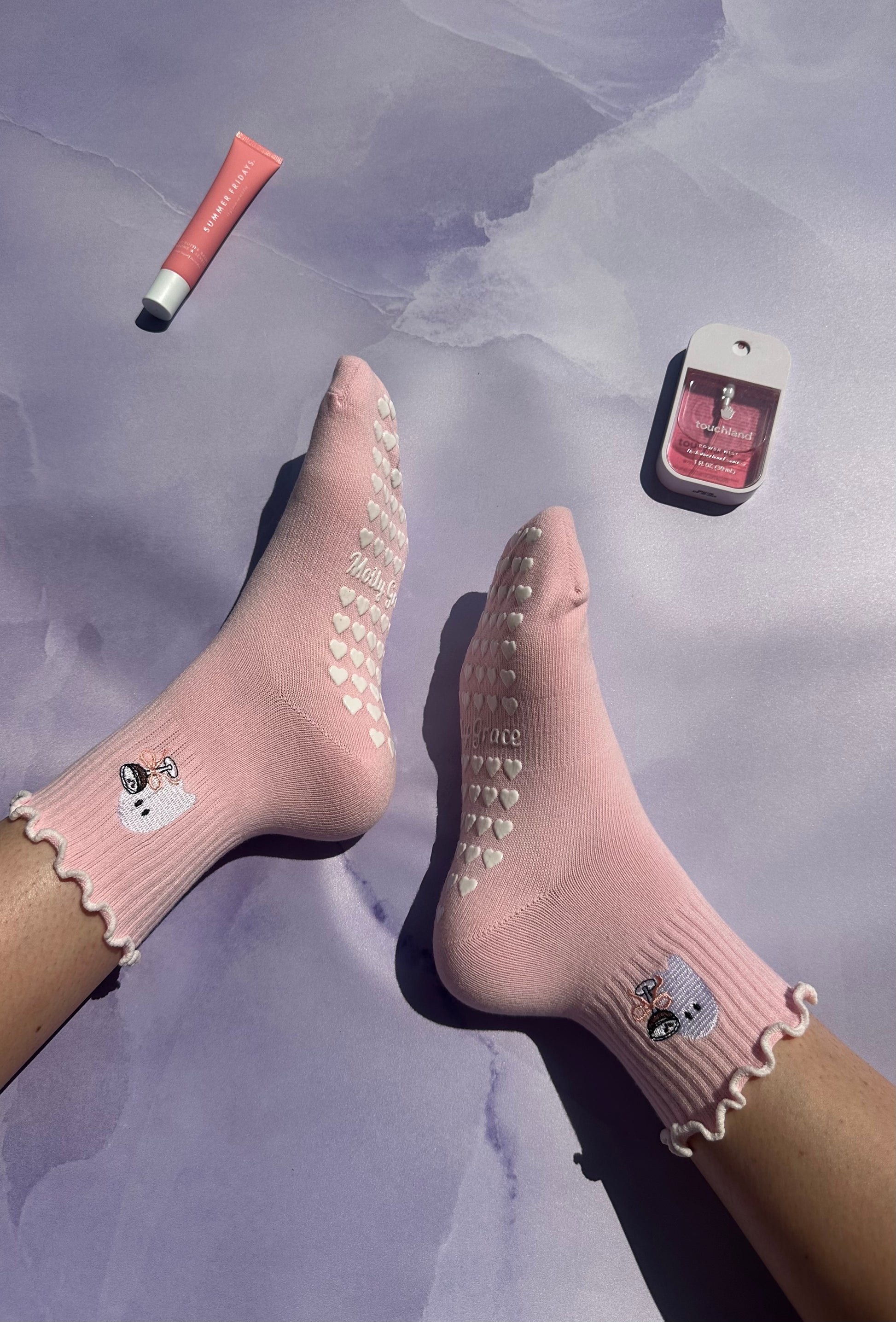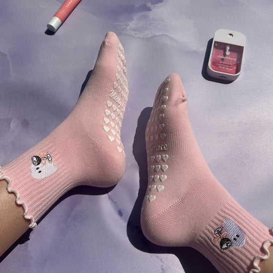 Bring some spooky-cute energy to your workout with our Espresso Martini Ghost Grip Socks! These pastel pink socks feature an adorable embroidered ghost holding everyone’s favorite cocktail and non-slip white heart grips on the soles. Perfect for Pilates, barre, yoga, or lounging, they combine function with fun so you can move safely in style.