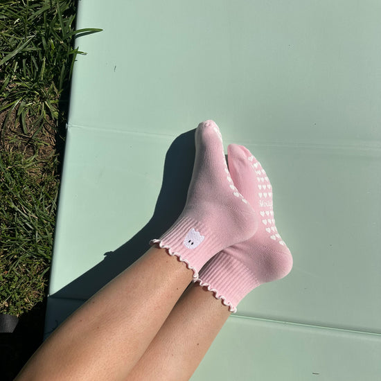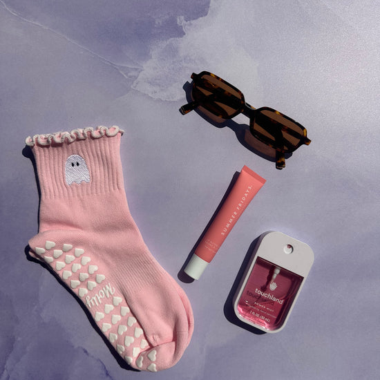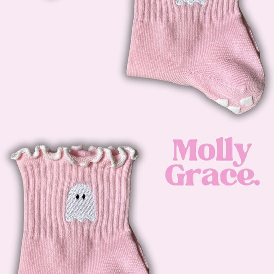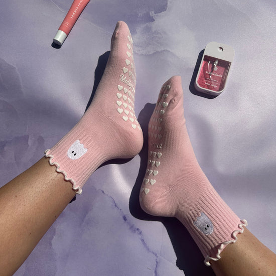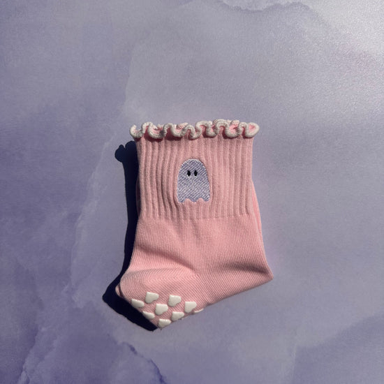 Cute meets functional with our pink ruffle grip socks, featuring an embroidered ghost design. Non-slip white heart grips keep you steady during Pilates, barre, or yoga, while the ruffle trim adds a playful, feminine touch. The perfect blend of spooky and sweet for your workout or lounge routine.