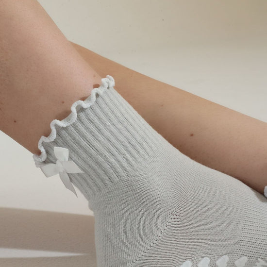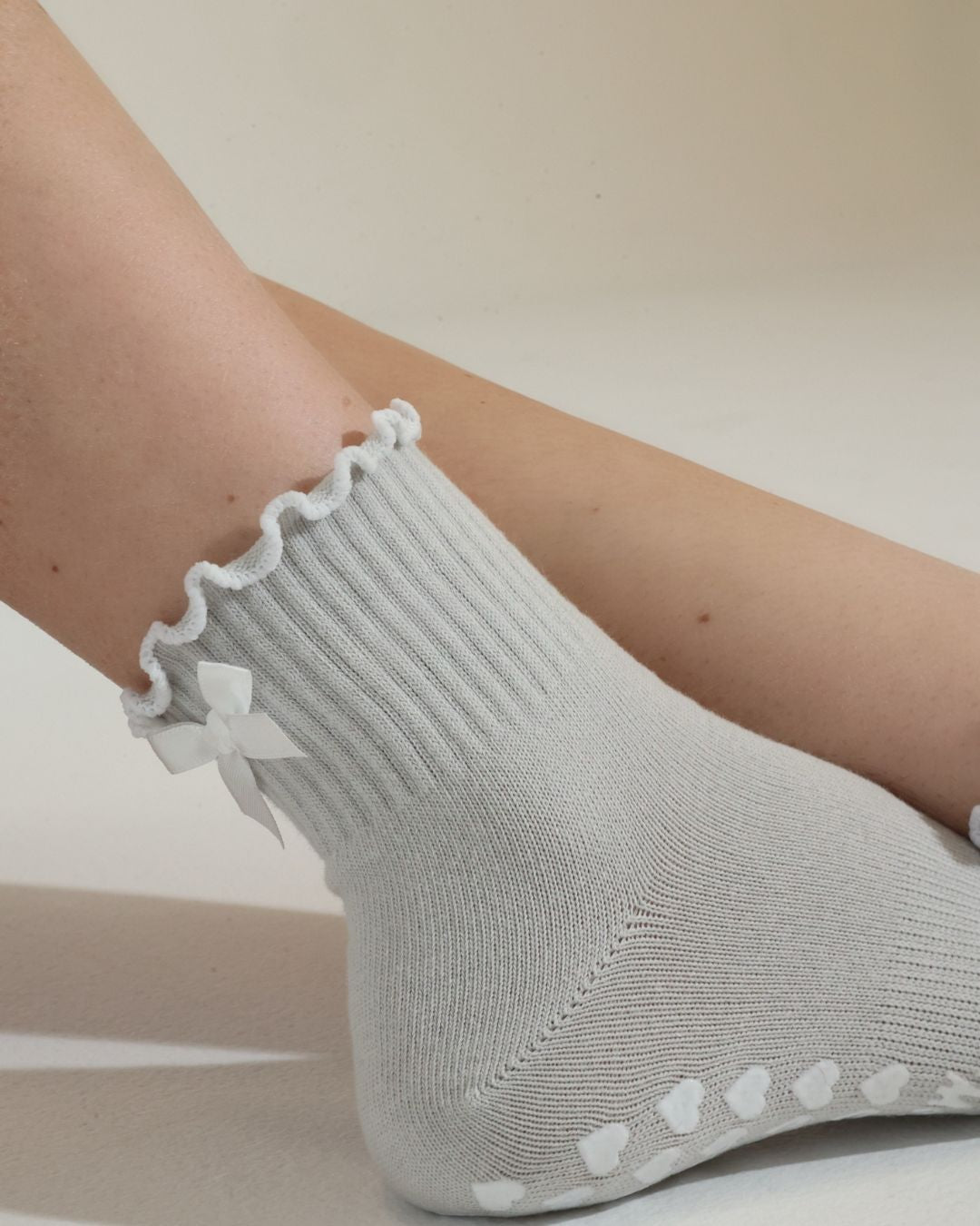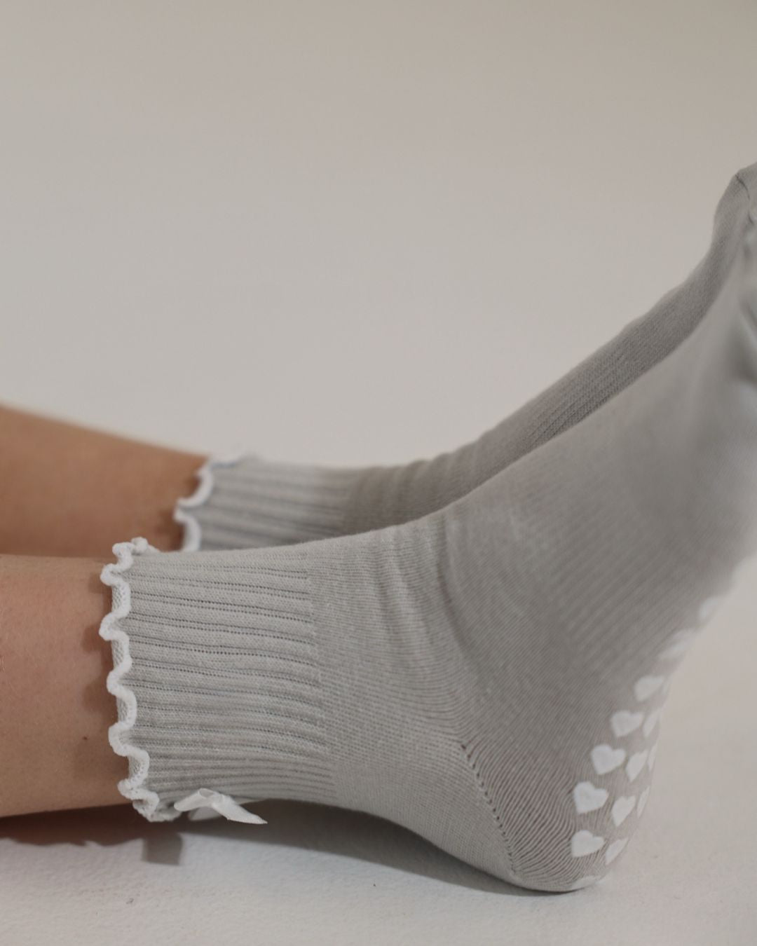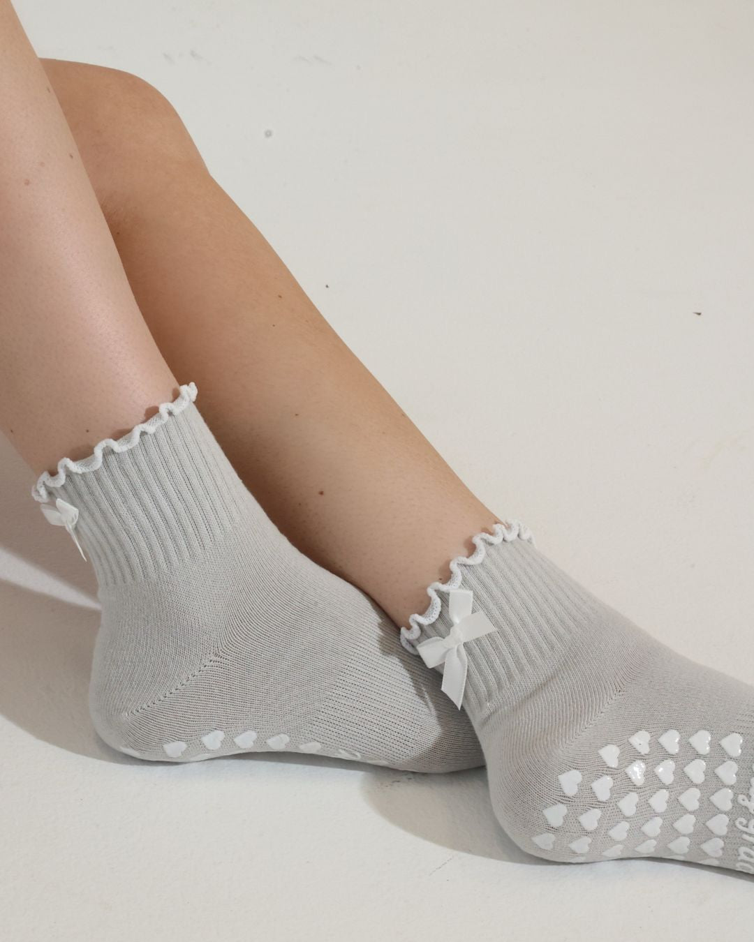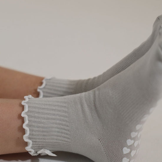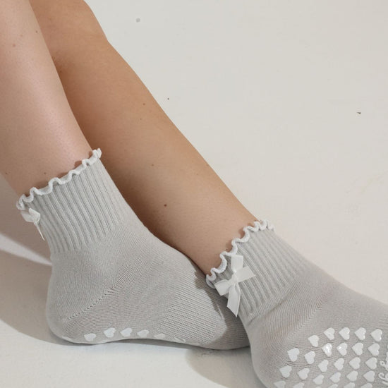 Stone gray ruffle grip socks finished with a delicate white bow and white heart non-slip grips. Designed for Pilates, barre, yoga, and studio workouts, these socks combine feminine style with the support you need for confident movement.