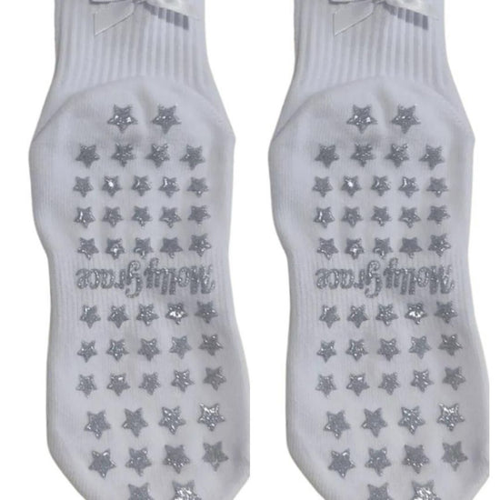 A timeless classic with a touch of sparkle. Our ballet white ruffle grip sock features a delicate white bow and shimmering silver glitter grips for elegant, slip-free support. Designed to keep you feeling polished and confident on the reformer, mat, or barre—because a little sparkle belongs in every workout.